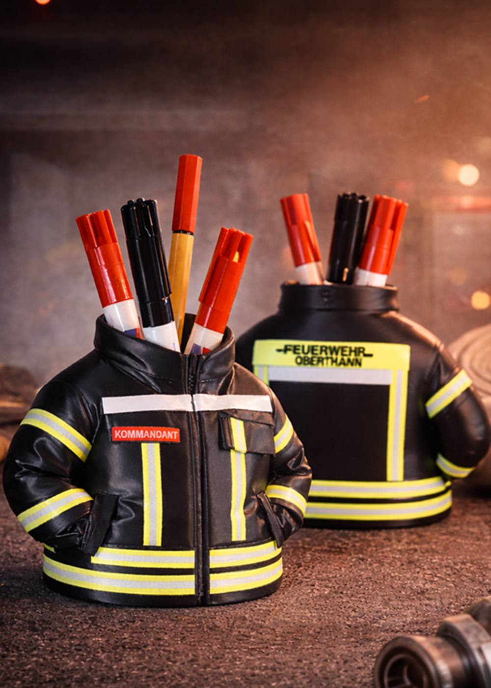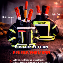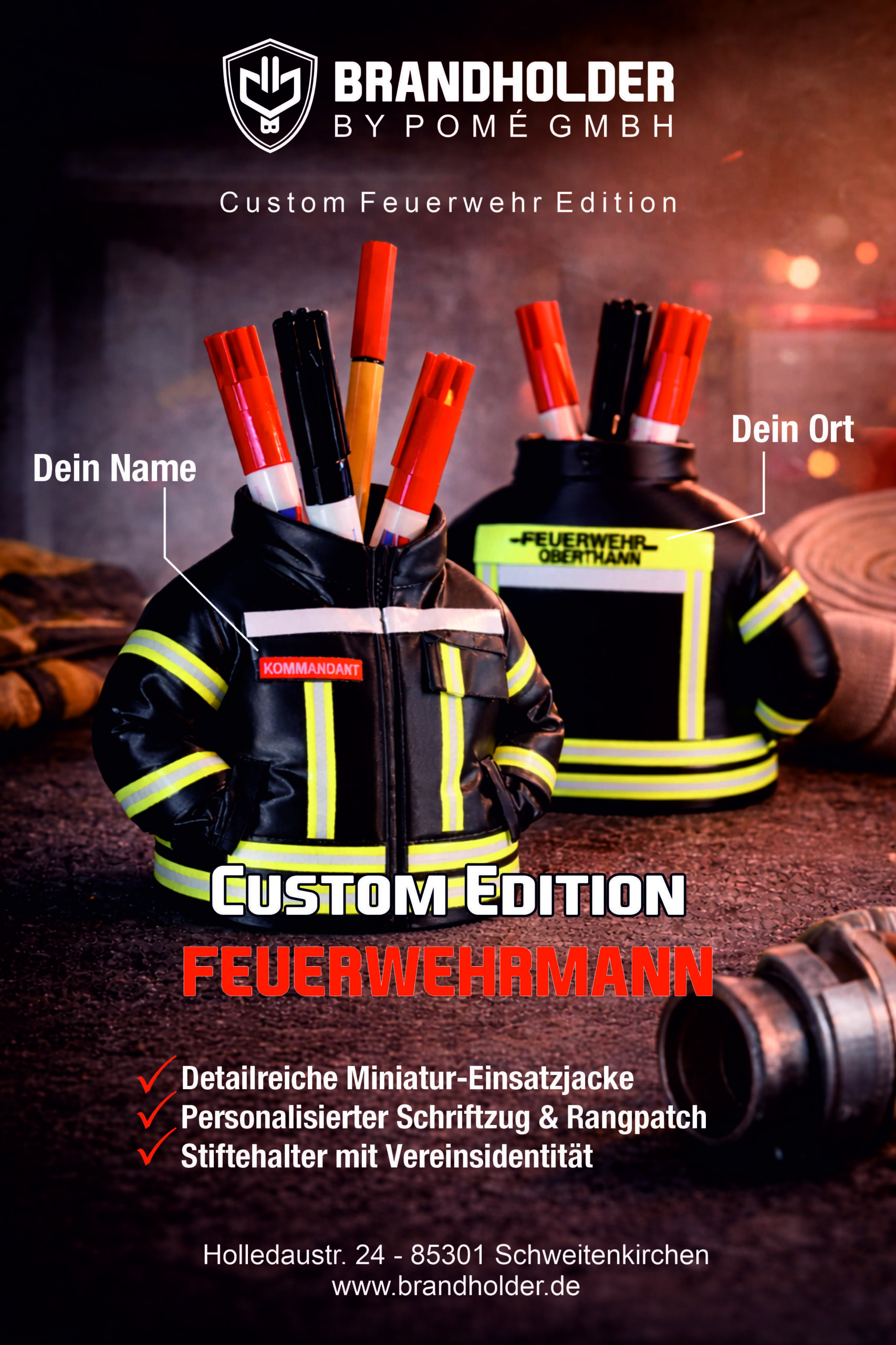 Mit der Brandholder Custom Feuerwehr Edition holen Sie sich ein Stück Feuerwehrgeschichte auf den Schreibtisch. Jede Miniatur wird individuell gefertigt und trägt genau das, was Ihre echte Jacke ausmacht: Ihren Namen, Ihren Rang und den Ortsnamen Ihrer Feuerwehr.